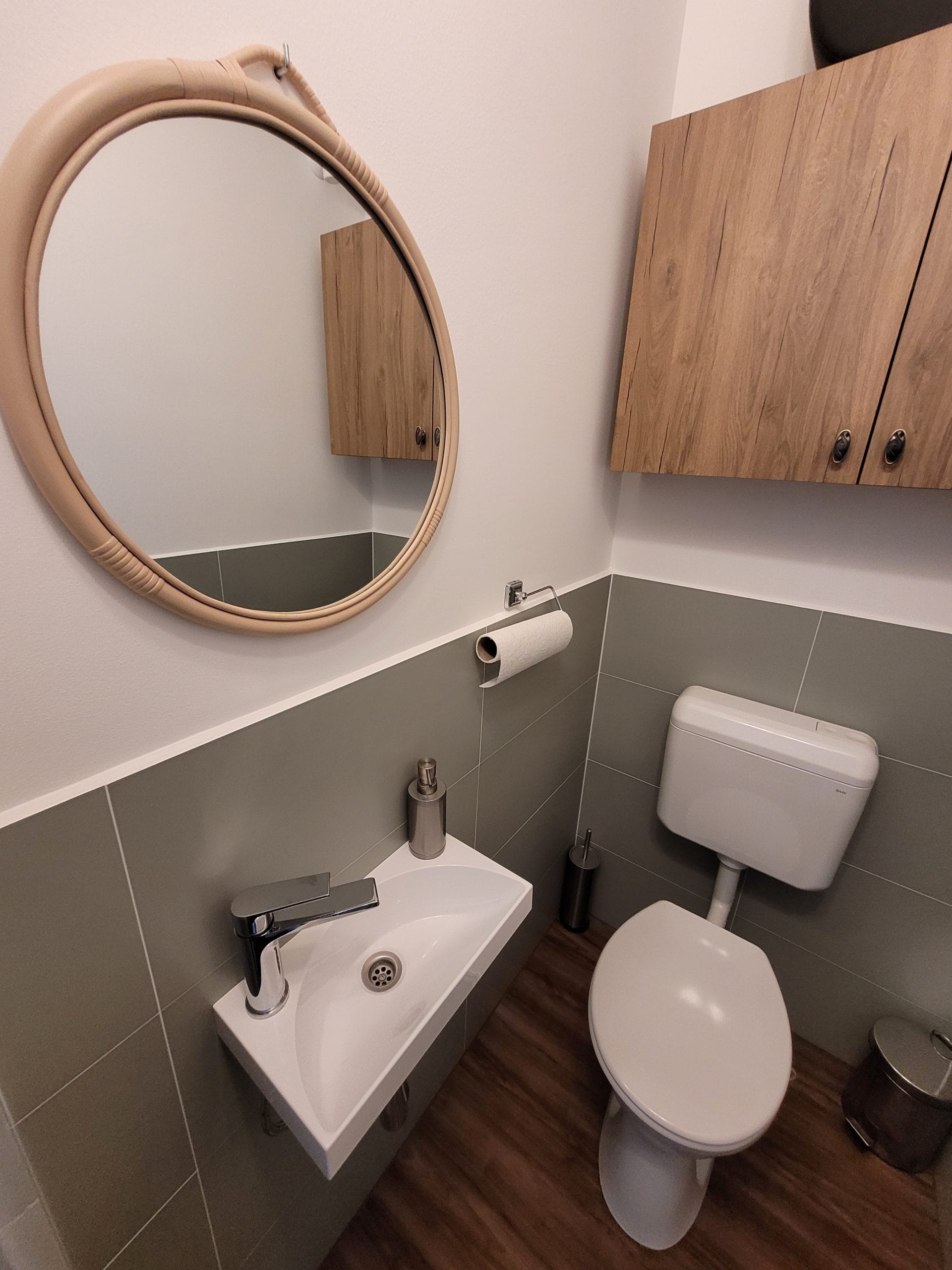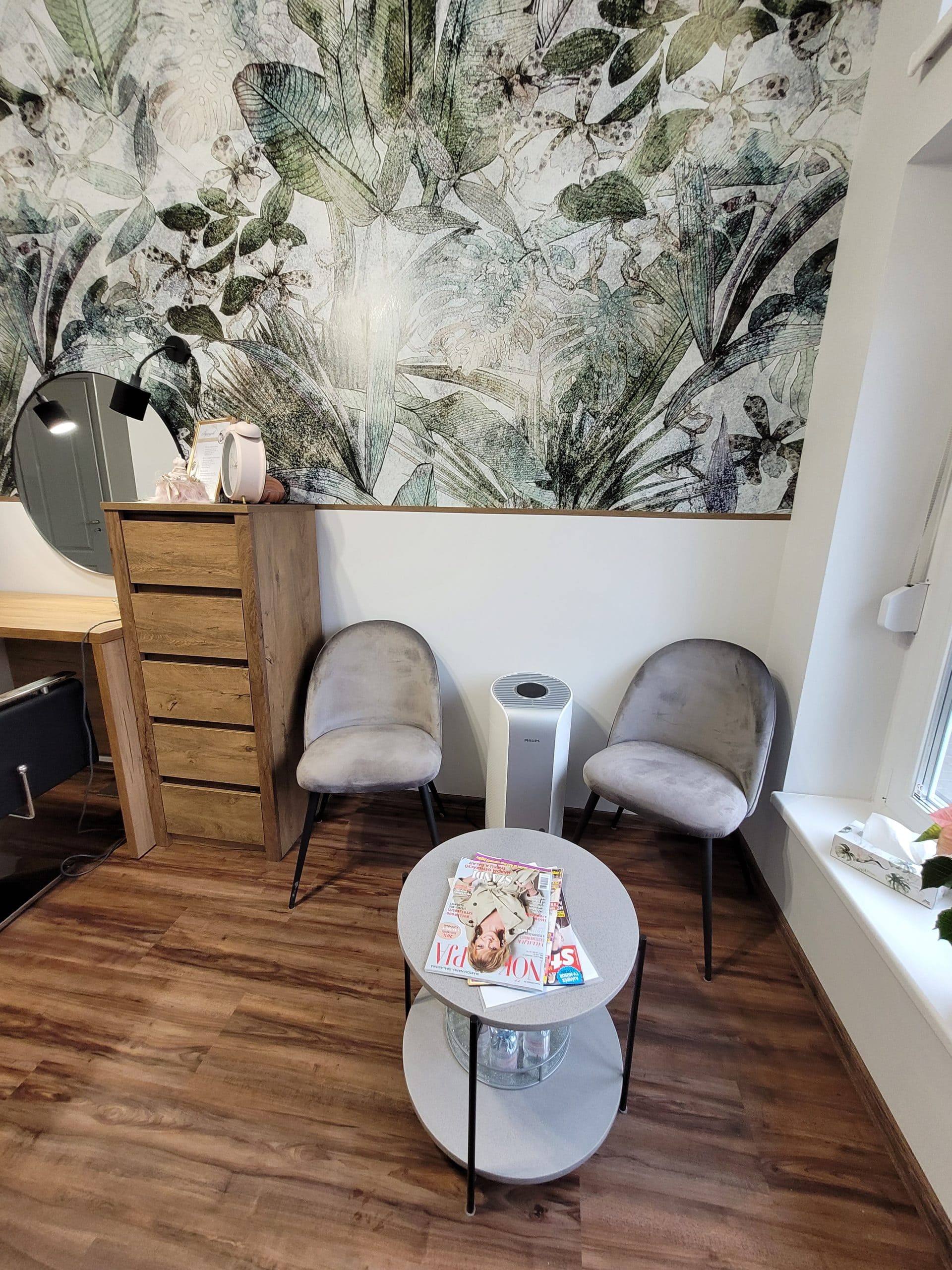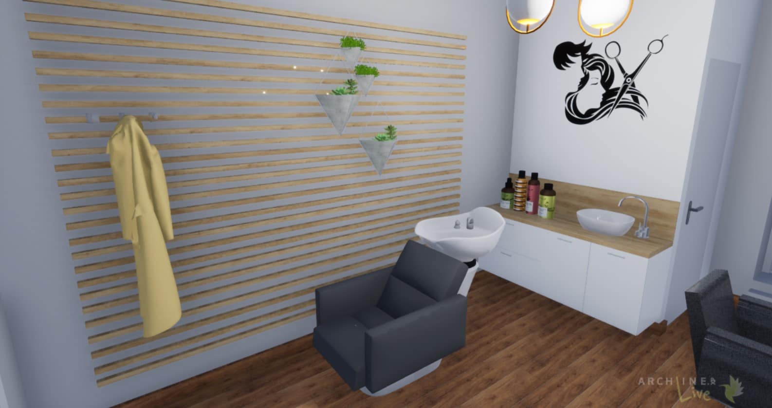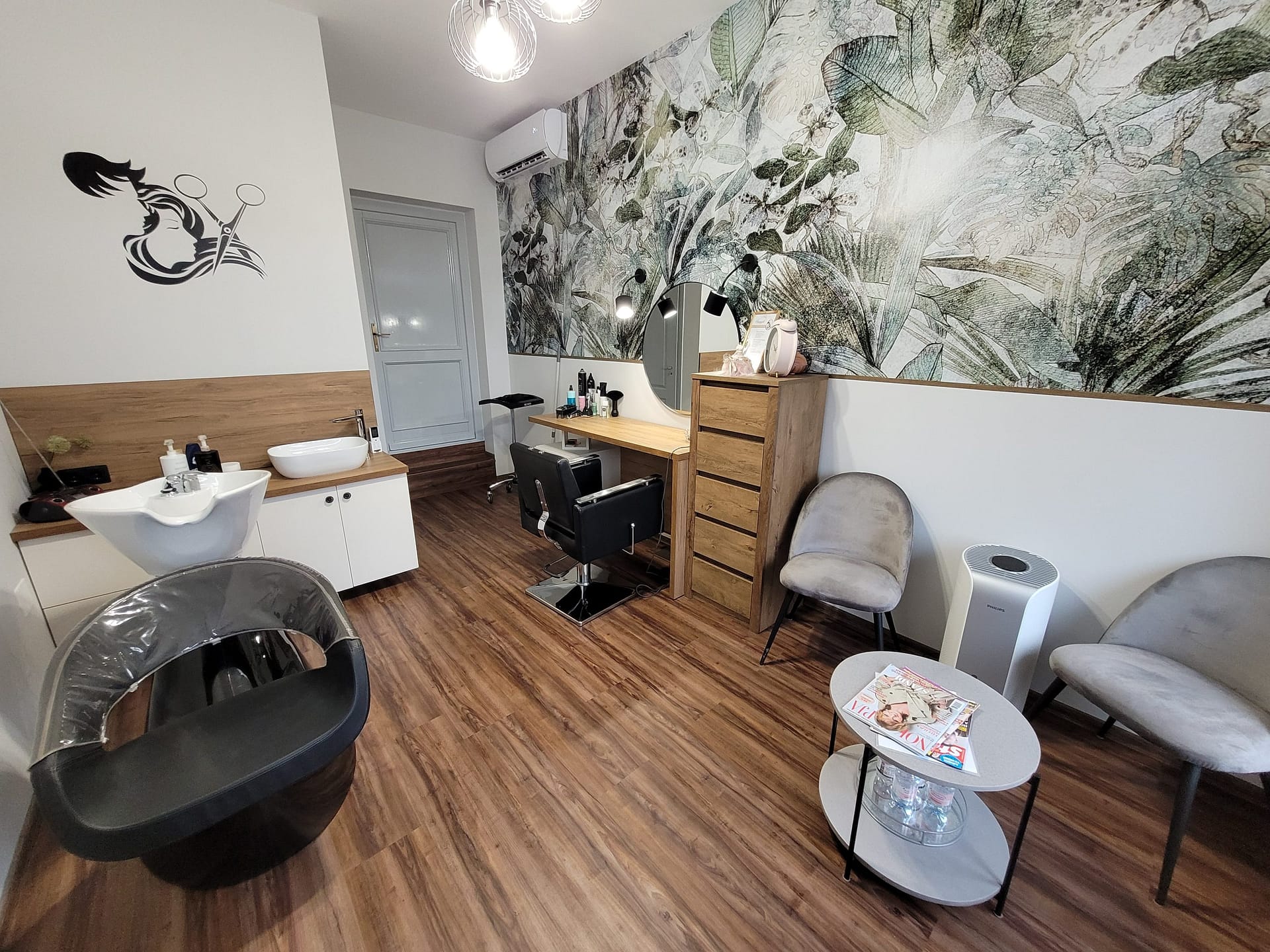 Így született meg benne a döntés, hogy a garázsát alakíttatja át fodrász üzletté. 15 nm-es helyiség, 3 m-es belmagassággal, üveg portállal. Fényes, kellemes tér lesz, így a színekkel is bánhatunk bátrabban, megengedhetjük a sötétebb árnyalatokat is. Az elvárások, elképzelések megvitatása után szabad kezet kaptam, ami a dizájnt illeti. Az első, tapogatózó verzió után – ami nagyon tetszett ügyfelemnek- úgy éreztem, nem ez az igazi és egy-két dolgon változtattam, például, a fő fal kapott egy zöld, hatalmas mintás tapétát, ami teljesen megváltoztatta az egész helyiség hangulatát és a szemközti falon, divatos, vízszintes lécezésű panel kapott helyet, ami egyben a fogasok helye is lesz. Így nem szabdaltuk fel a falfelületeket, optikailag is megtartotta a tágasság érzetét.