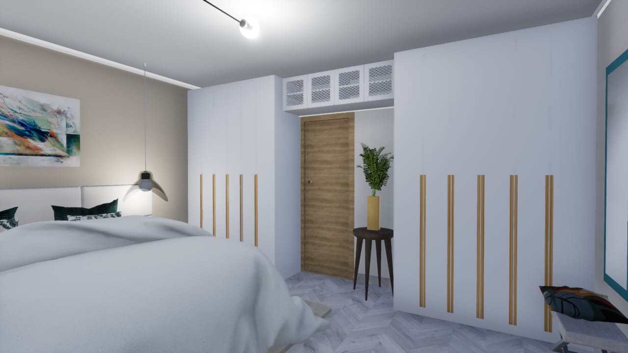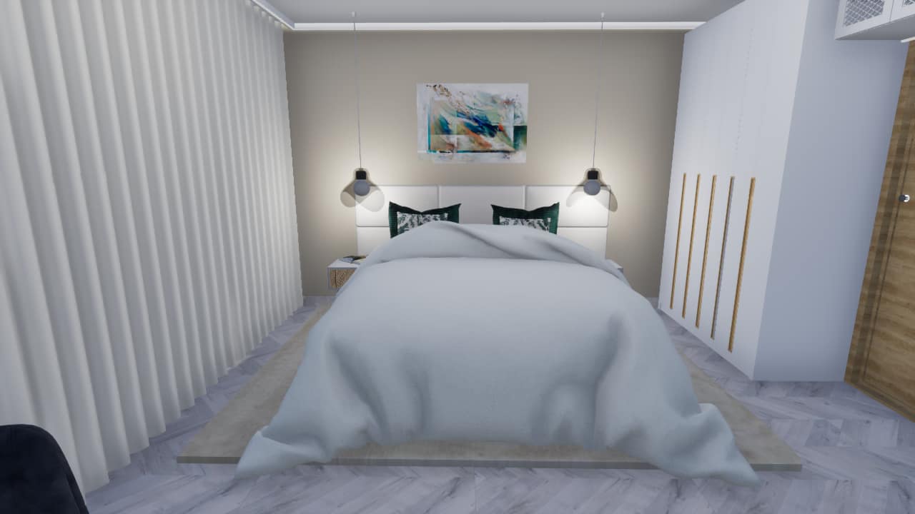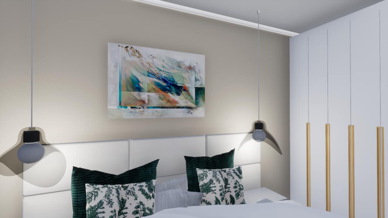 Manapság már nincs hiány lehetőségekben, hogy a környezetünket, otthonunkat és annak tereit kedvünkre alakítsuk. Mégis a legfőbb szempont, hogy számunkra jó legyen! Betöltse funkcióját és biztosítsa a regenerálódást, az elvonulást, a pihenést a napi teendők után. Ahogyan az elrendezést, berendezést megválaszthatjuk, úgy a színvilágot is. Helyezzünk hangsúlyt az alapos átgondolásra! A világos színek, azon felül, hogy optikailag tágítják a teret, kellemesen nyugtató hatásúak is egy pörgősebb nap után. Ez a hálószoba egy addig nem lakás-célú helyiségből alakul majd ki. Visszatérő kedves hölgy megrendelőm egy nőies, kellemes hangulatú hálót szeretne, ahova esténként úgy kuckózhatnak be, mint a nyugalom szigetére. A szobából nyíló tolóajtós fürdő is csak az övék lesz, két személy számára teljesen ideális.